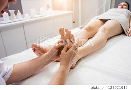 Beautiful young woman enjoying foot massage in spa salon. Cosmetology