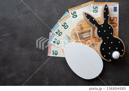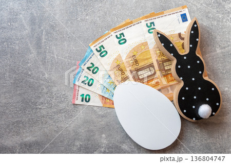 Black and white wood rabbit and egg with cash euro money for easter celebration on the stone background. Shopping of Easter holidays. Space for text.