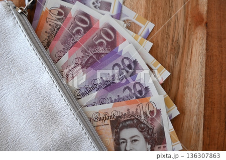 Silver partmone with british pound money. United Kindom bills in leather wallet for commerce concept.