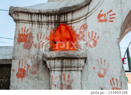 Ganesha sculpture applied by Sindoor (vermillion) situated in Pashupatinath temple in Kathmandu, Nepal. Sindoor is applied to sculptures for religious and symbolic reasons.