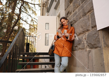 Busy afternoon in the city as a young woman enjoys her time while checking her phone near a stone building