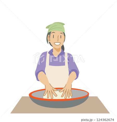 こね鉢でそば粉をこねる女性