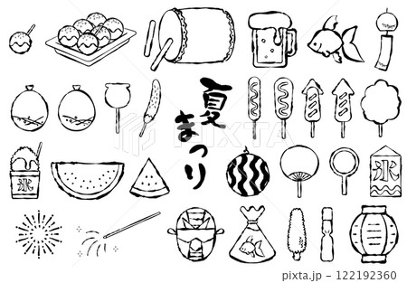 夏祭りアイコンベクターイラストセット 線画 モノクロ 白黒 毛筆 日本