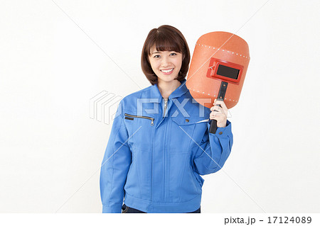 溶接マスクを持った女性作業員
