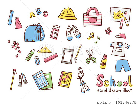 学校生活で使う道具のシンプルな手描きベクター線画イラスト