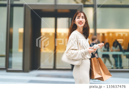 Single adult asian woman holding smartphone and shopping bag on black friday sale city lifestyle