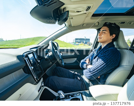 自動運転車でハンズフリー運転を楽しむ男性 クルーズコントロール
