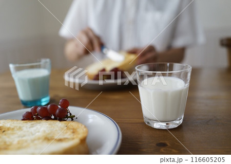 朝食はトーストを焼いて牛乳、果物