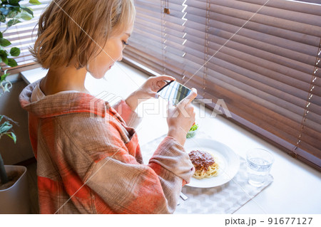 スマホで食事の写真を撮る若い女性