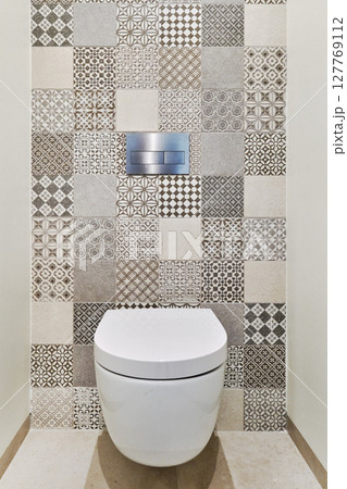 Modern furnished minimalist bathroom light grey interior design with metro style grey tiles