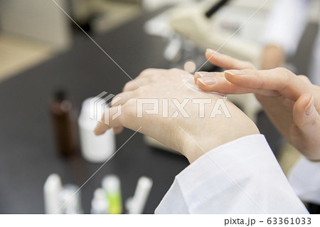 化粧品開発イメージ ハンドクリームを開発する女性研究員手元