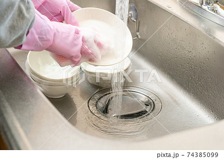 ゴム手袋で皿洗いをする