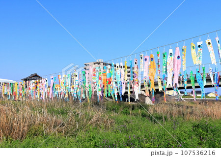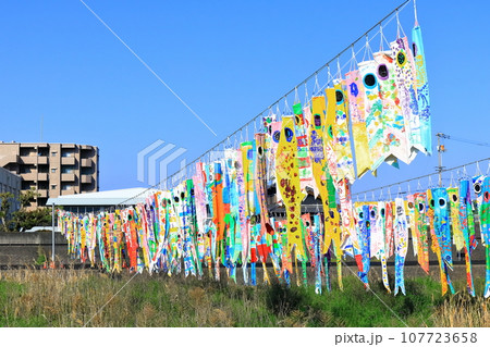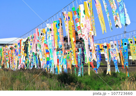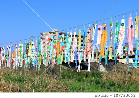 河川敷を泳ぐ小学生の手作り鯉のぼり(端午の節句)