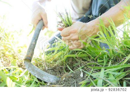 鎌で草刈りをする