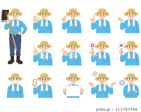 農家の中年男性 表情とジェスチャーのイラスト素材セット