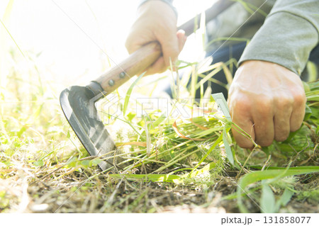 Man working in the garden with weeding hoe