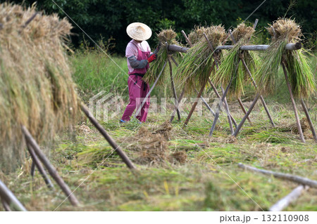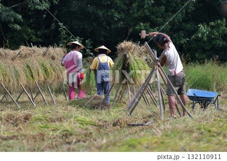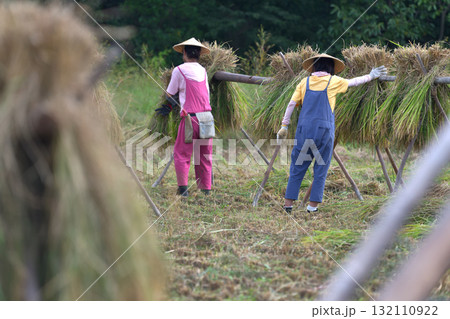 稲刈り 一条刈りバインダーでの作業風景 自然乾燥派の農家