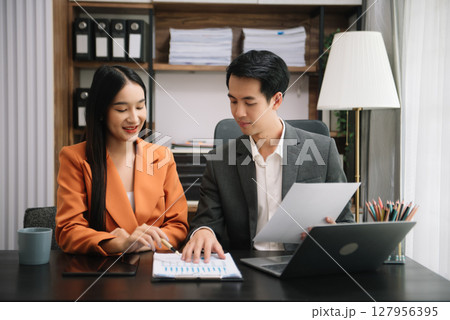 Asian business colleague business presents and explains and using laptop and tablet. Teamwork, financial marketing team, while sitting in modern office
