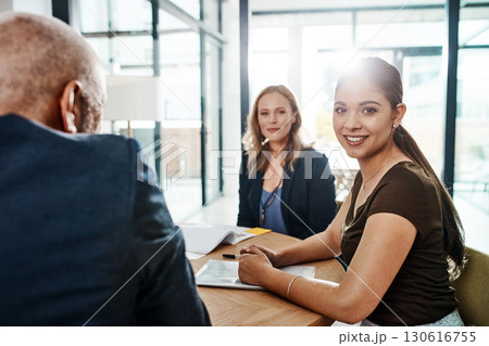 Meeting, planning and teamwork with woman portrait for success, confidence and hr management discussion. Communication, leadership and collaboration of business people, person or group with a smile