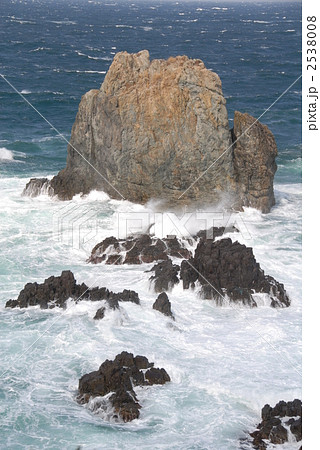 「青森県」岩に打ち寄せる荒波 波しぶき