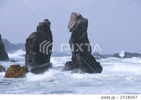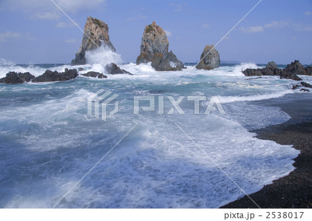 「青森県」岩に打ち寄せる荒波 波しぶき