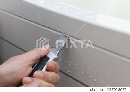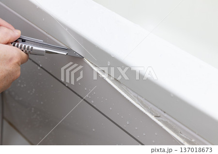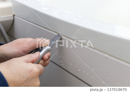 カッターナイフでユニットバスの浴槽の古いコーキングを除去している