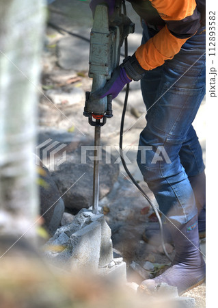 ハツリ工事 ハンマードリルでコンクリートブロックを斫る作業員
