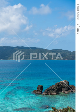 透明度の高い綺麗な奄美の夏の海と砂浜と磯と青空のコラボ