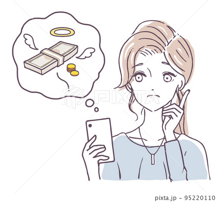 お金がない女性 スマホ サブスク ゲームアプリ 金欠 悩む人物 イラスト素材