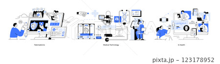 Telemedicine e-health medical technology. Professionals using advanced technologies telemedicine, medical robotics health monitoring devices. Healthcare medical technology, e-health, tech advancements