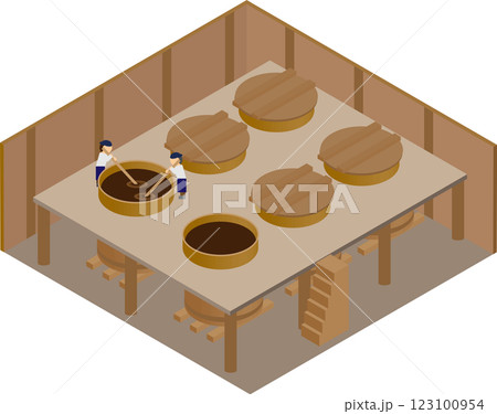 アイソメトリックな醤油の蔵で醤油を作っている職人のイラスト