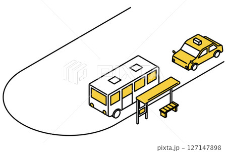 バス停のあるロータリーにバスとタクシーが停車しているシンプルな線画アイソメトリックイラスト