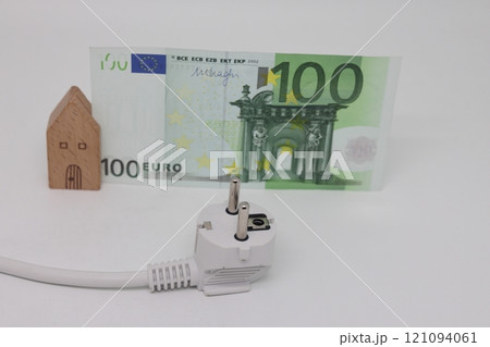 White electric cable and banknotes against the background of a toy model house