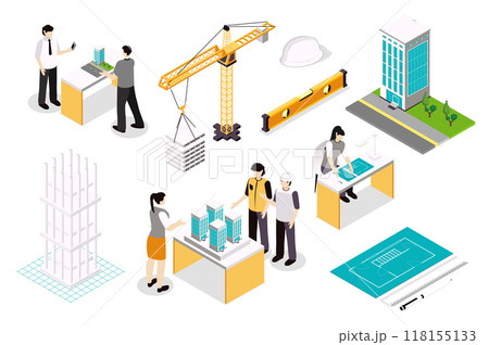 Construction engineers 3d isometric mega set in isometry graphic design. Collection elements of architect, crane, level, helmet, skyscraper, drawing plan, builders, frame, other. Vector illustration.