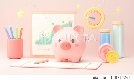 3D piggy bank with a rising savings chart on a pink background with coin and stationary