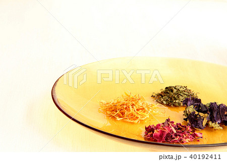 ガラス皿のドライハーブ(マリーゴールド、ペパーミント、マローブルー、ローズ)