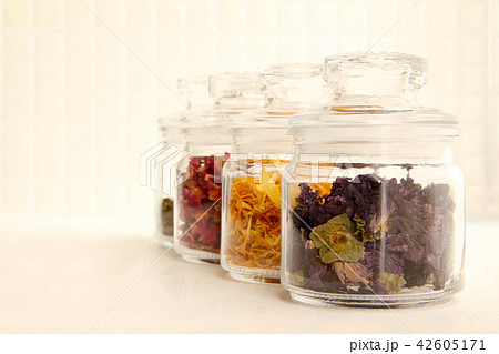 瓶に入ったドライハーブ(マリーゴールド、ペパーミント、マローブルー、ローズ)