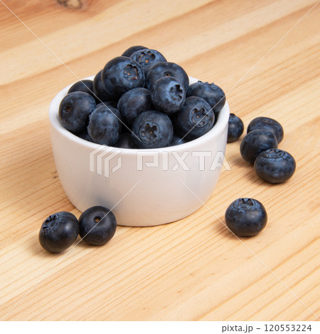 Fresh blueberry in white dish on wooden background