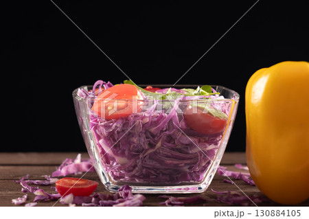 Red cabbage and yellow bell pepper in glass bowl