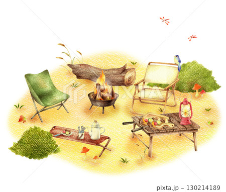 秋の野原のキャンプのバーベキュー 手描き色鉛筆画