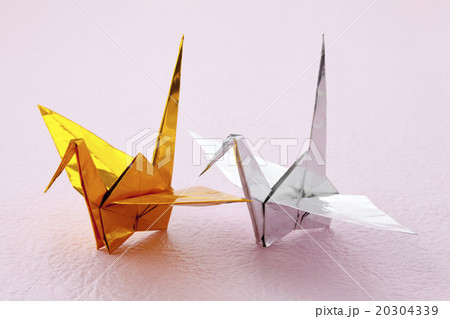 金と銀の並ぶ2羽のおり鶴横位置