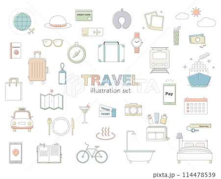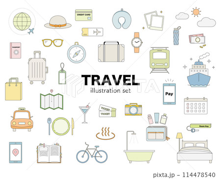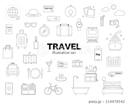旅行 トラベル イラスト セット 線画 飛行機 スーツケース 温泉 カメラ モバイル GW バカンス