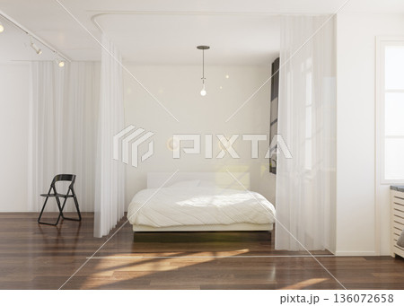 3D render of a minimalist bedroom in a modern studio apartment
