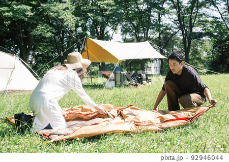 テントの設営をするカップル・キャンプ・アウトドアレジャー