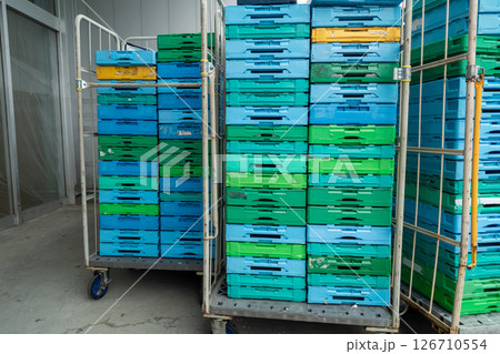 たくさんの重ねられたカゴ台車と折りたたみコンテナ