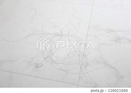 脱衣所(クッションフロア)の床に大量の髪の毛が落ちている