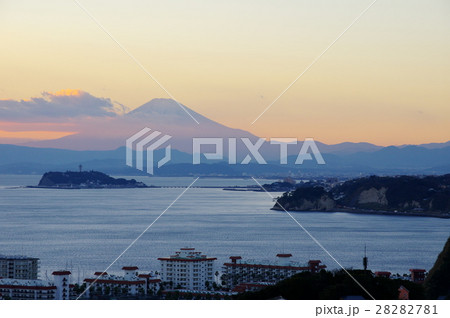 神奈川県鎌倉市の披露山公園より夕暮れの江の島と富士山を望む