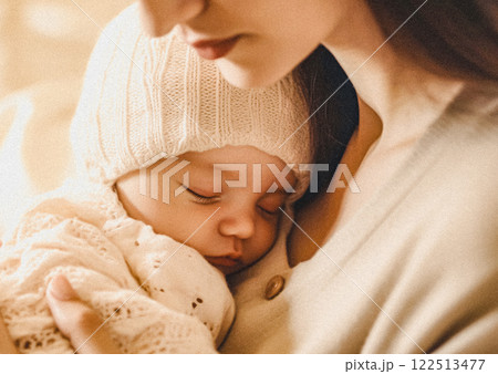お母さんに抱っこされて安心する子ザルの後ろ姿