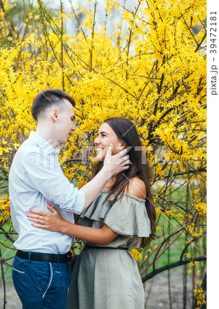 Portrait of young couple in spring mood. Blooming trees around man and woman