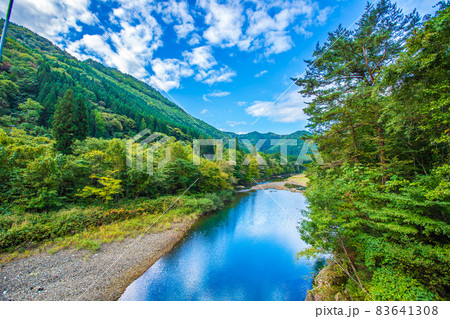 抱返渓谷 誓願橋から青い水面を望む 玉川 秋田県仙北市 春 昼間 縦位置
